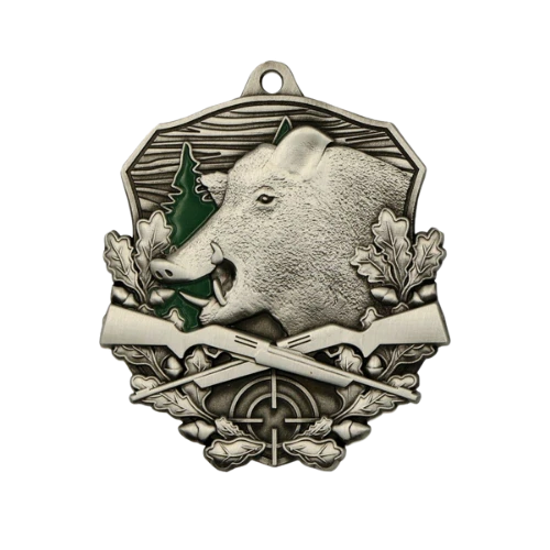 Medal myśliwski MD1670 to wyjątkowy medal odlewany w kolorze antycznego srebra z bogatym, szczegółowym reliefem – głowa dzika otoczona liśćmi dębu, skrzyżowane strzelby i celownik strzelecki tworzą kompozycję jednoznacznie nawiązującą do kultury łowieckiej. Zielone wykończenie tła podkreśla leśny charakter motywu. Duży format 7,9×7,4 cm i precyzja odlewu sprawiają, że to jeden z najbardziej efektownych medali myśliwskich dostępnych w ofercie.