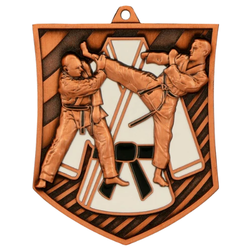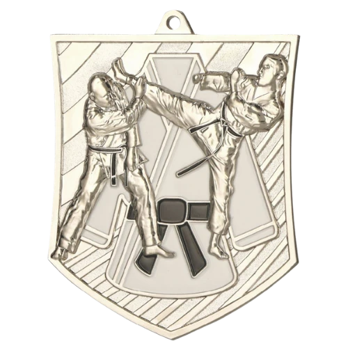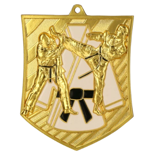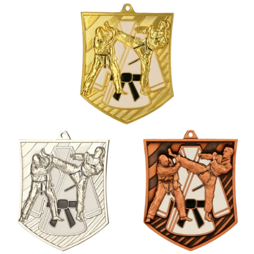 Medal sportowy MD8054 to medal odlewany dedykowany karate i sportom walki – dynamiczny relief z sylwetką zawodnika w kimonie wykonującego kopnięcie, osadzony na kwadratowej tarczy z diagonalnym podziałem. Wykonany z metalu, wymiary 7,9×6,6 cm. Dostępny w trzech wariantach: złotym, srebrnym i brązowym. Pasuje do wstążek 11 mm i 22 mm. Idealny na turnieje karate, taekwondo, judo i inne sporty walki.
