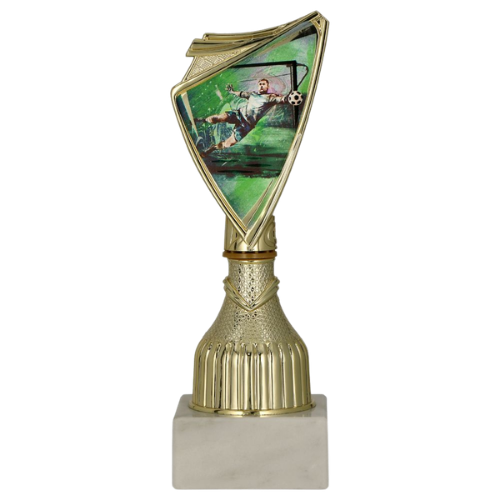 Efektowny puchar piłkarski w złotym kolorze z nowoczesnym panelem w kształcie tarczy, wypełnionym dynamiczną grafiką o tematyce piłkarskiej. Ilustracja przedstawia akcję bramkarską, dzięki czemu puchar świetnie pasuje do rozgrywek, w których wyróżnia się zarówno zwycięzców, jak i kategorie specjalne. Smukła forma oraz dekoracyjny panel sprawiają, że nagroda wyróżnia się na podium i dobrze prezentuje się w gablocie. Całość osadzona jest na marmurowej podstawie, która dodaje elegancji i zapewnia stabilność. Trzy warianty wysokości ułatwiają przygotowanie kompletów na podium oraz dopasowanie pucharu do rangi wydarzenia.