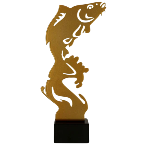 Statuetka metalowa Złoty Karp ML-FIS1 to nagroda przygotowana na zawody i wydarzenia związane z wędkarstwem. Forma przedstawia karpia unoszącego się nad taflą wody, dzięki czemu motyw nagrody jest od razu czytelny i dobrze dopasowany do konkursów wędkarskich, spotkań kół oraz imprez organizowanych nad wodą. Złote wykończenie w połączeniu z marmurową podstawą tworzy spójną oprawę nagrody i dobrze prezentuje się podczas wręczenia. To model odpowiedni dla organizatorów, którzy szukają statuetki wędkarskiej z wyraźnym motywem ryby i miejscem na personalizację.