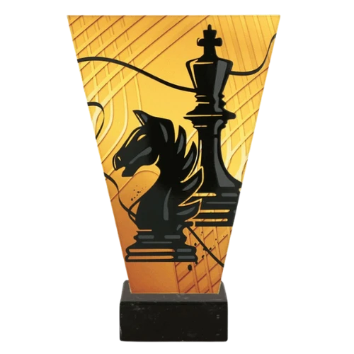 Trofeum szklane V-Line VL1-CHE/BK to nagroda przygotowana z myślą o wydarzeniach związanych z szachami. Front trofeum zdobi grafika figur szachowych, w tym króla i skoczka, dzięki czemu charakter wyróżnienia jest od razu czytelny i dobrze pasuje do turniejów, rozgrywek szkolnych oraz wydarzeń organizowanych przez kluby i stowarzyszenia szachowe. Złoto-czarna kolorystyka dobrze współgra z okolicznościowym charakterem nagrody, a ciemna marmurowa podstawa porządkuje całość i tworzy miejsce na personalizację. To model odpowiedni tam, gdzie potrzebne jest wyraziste trofeum szachowe dostępne w kilku wysokościach.