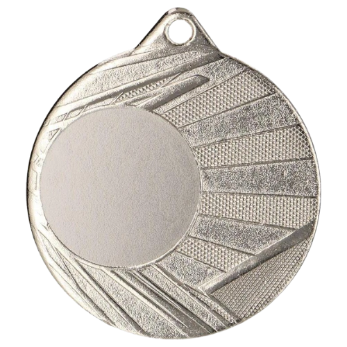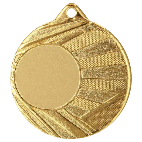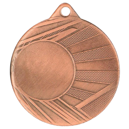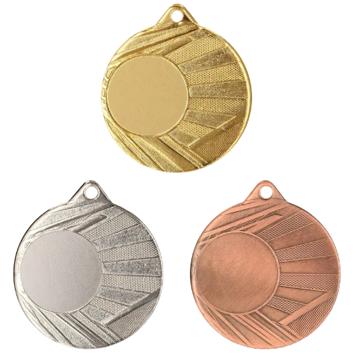 Medal ME006 to okrągły medal sportowy o średnicy 50 mm z wzorem na ramce i gładką powierzchnią środkową pod emblemat. Wykonany z metalu. Dostępny w trzech wariantach kolorystycznych: złotym, srebrnym i brązowym. Emblemat z tyłu o średnicy 50 mm. Pasuje do wstążek 11 mm i 22 mm.