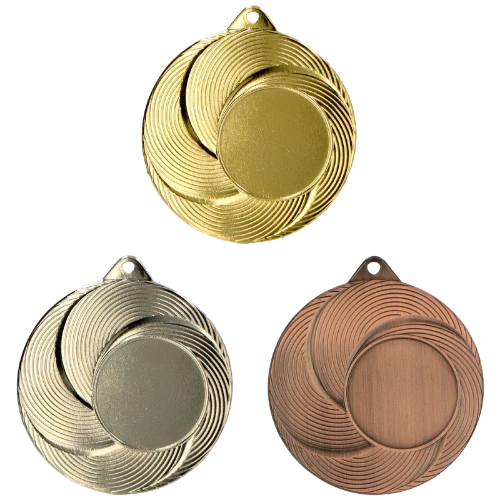 Medal MMC2050 to stalowy medal sportowy o średnicy 50 mm z koncentrycznym wzorem rowków na ramce i gładką powierzchnią środkową pod emblemat. Wykonany ze stali. Dostępny w trzech wariantach kolorystycznych: złotym, srebrnym i brązowym. Emblemat z tyłu o średnicy 48 mm. Pasuje do wstążek 11 mm i 22 mm.