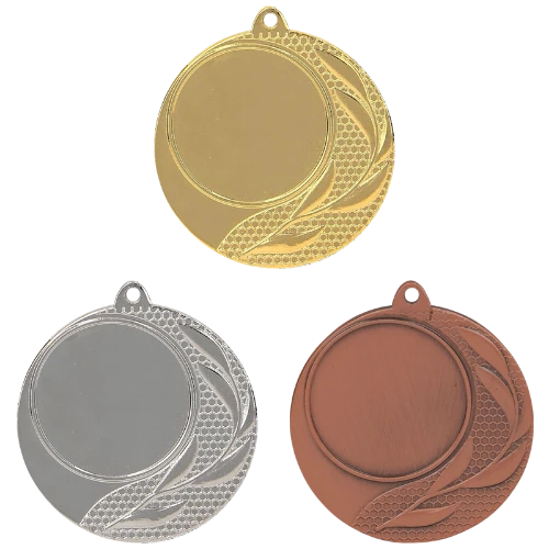 Medal MMC2540 to okrągły medal sportowy średnicy 40 mm z nowoczesną, geometryczną ramką – ukośne linie i trójkątny wzór tworzą dynamiczny, współczesny design odróżniający go od klasycznych medali z florystyczną dekoracją. Gładka środkowa powierzchnia przygotowana jest pod emblemat z przodu i nadruk sublimacyjny z tyłu (40 mm). Dostępny w trzech wariantach: złotym, srebrnym i brązowym. Pasuje do wstążek 11 mm i 22 mm.