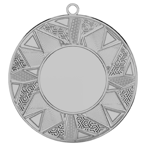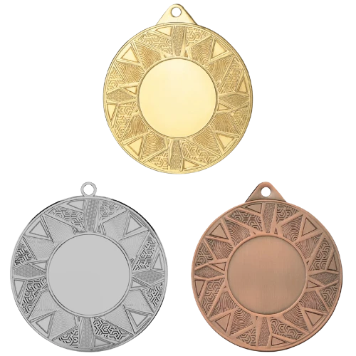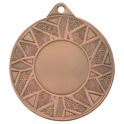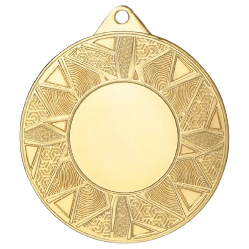 Medal ME5002 to okrągły medal sportowy o średnicy 50 mm z geometrycznym wzorem na ramce i gładką powierzchnią środkową pod emblemat. Dostępny w trzech wariantach kolorystycznych: złotym, srebrnym i brązowym. Emblemat z tyłu o średnicy 50 mm daje duże pole na nadruk sublimacyjny. Pasuje do wstążek 11 mm i 22 mm.
