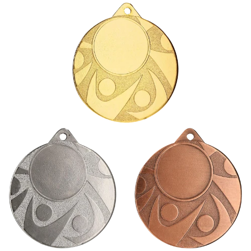 Medal MMC5850 to okrągły medal sportowy o średnicy 50 mm z wzorem na ramce i gładką powierzchnią środkową pod emblemat. Wykonany z metalu. Dostępny w trzech wariantach kolorystycznych: złotym, srebrnym i brązowym. Emblemat z tyłu o średnicy 50 mm. Pasuje do wstążek 11 mm i 22 mm.