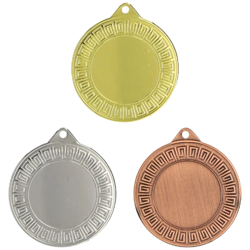 Medal MMC7140 to okrągły medal sportowy średnicy 40 mm z wyjątkową ramką zdobioną greckim wzorem meandrowym – rytmiczny motyw kwadratowych spiral biegnący dookoła obrzeża nawiązuje do antycznej tradycji olimpijskiej. To jeden z najbardziej charakterystycznych wzorów w całej ofercie medali blank – elegancki, rozpoznawalny i ponadczasowy. Gładka środkowa powierzchnia przygotowana jest pod emblemat z przodu i nadruk sublimacyjny z tyłu (40 mm). Dostępny w trzech wariantach: złotym, srebrnym i brązowym. Pasuje do wstążek 11 mm i 22 mm.