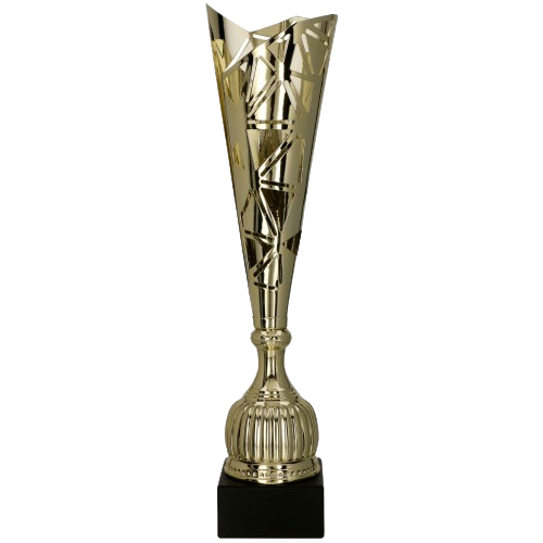 Model 4230 to wysoki, smukły puchar o wyrazistej, nowoczesnej formie. Rozszerzająca się ku górze czasza została urozmaicona ażurowymi wycięciami oraz geometrycznymi przetłoczeniami, które nadają całości dynamiczny charakter. Złote wykończenie podkreśla ostre linie konstrukcji, a dekoracyjna podstawa przechodząca w marmurowy cokół zapewnia stabilność i eleganckie wykończenie.