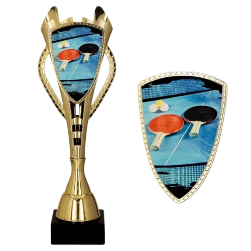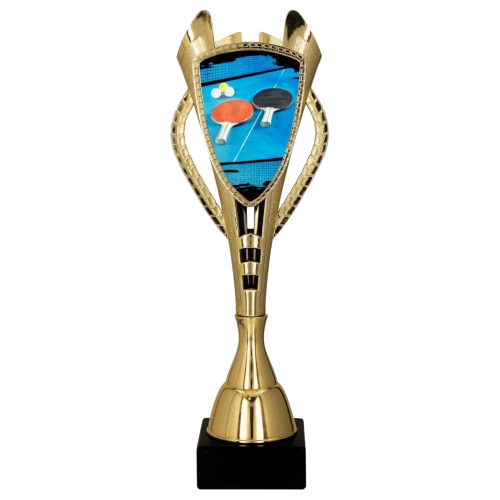 Puchar plastikowy złoty 7243/TAB to nagroda przygotowana z myślą o wydarzeniach związanych z tenisem stołowym. Górną część pucharu uzupełnia wkładka z grafiką rakietek i piłeczek na tle stołu do gry, dzięki czemu charakter wyróżnienia jest od razu czytelny i dobrze pasuje do turniejów, zawodów szkolnych oraz rozgrywek klubowych. Złota forma w połączeniu z ciemną marmurową podstawą porządkuje całość i nadaje modelowi klasyczny wygląd. To propozycja odpowiednia tam, gdzie potrzebny jest wyższy puchar sportowy dostępny w kilku rozmiarach.
