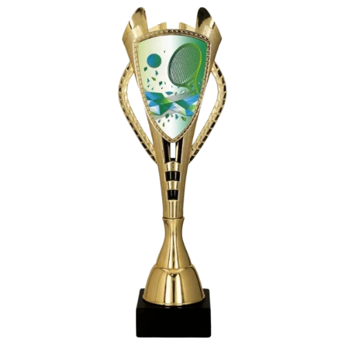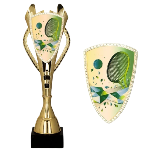 - puchar sportowy z tarczą z grafiką rakiety tenisowej i piłki