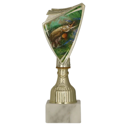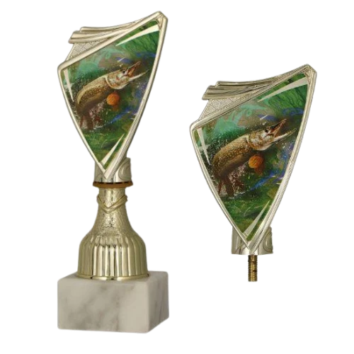 - puchar sportowy z tarczą z grafiką szczupaka