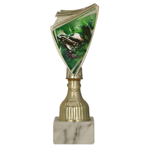 Efektowny puchar piłkarski w złotym kolorze z nowoczesną tarczą i dynamiczną grafiką w odcieniach zieleni, która podkreśla sportowy charakter nagrody. W górnej części pucharu znajduje się panel w kształcie tarczy, dzięki któremu trofeum wyróżnia się na podium oraz świetnie prezentuje się w gablocie. Całość osadzona jest na marmurowej podstawie, zapewniającej stabilność i elegancki wygląd. Model dostępny jest w trzech wariantach wysokości, co ułatwia dopasowanie nagród do rangi wydarzenia i przygotowanie kompletów na podium.