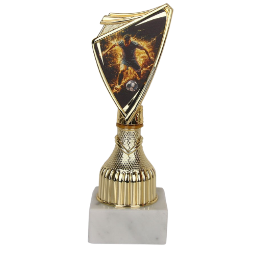 Efektowny puchar piłkarski w złotym kolorze z dekoracyjną tarczą i dynamiczną grafiką przedstawiającą piłkarza w akcji. Tarcza ma nowoczesny, trójkątny kształt i wyróżnia puchar na podium, a intensywna, „ognista” stylistyka grafiki dodaje nagrodzie charakteru i świetnie wygląda na zdjęciach z dekoracji. Całość osadzona jest na marmurowej podstawie, która zwiększa stabilność i podkreśla rangę wyróżnienia. Puchar dostępny jest w trzech wariantach wysokości, dzięki czemu łatwo przygotujesz komplety na podium lub dopasujesz nagrody do różnych kategorii turnieju.