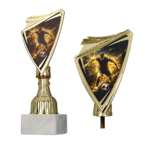 - puchar sportowy z motywem piłki nożnej i dynamiczną grafiką na tarczy