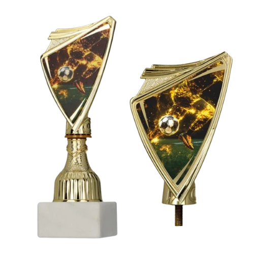 Efektowny puchar piłkarski w złotym kolorze z nowoczesnym panelem w kształcie tarczy, wypełnionym dynamiczną grafiką o tematyce piłki nożnej. Kompozycja z piłką i energicznym tłem nadaje nagrodzie mocny, turniejowy charakter – puchar świetnie prezentuje się na podium oraz na zdjęciach z dekoracji. Całość osadzona jest na marmurowej podstawie, która podkreśla elegancki wygląd i zapewnia stabilność. Trzy warianty wysokości ułatwiają przygotowanie kompletów na podium lub dopasowanie nagród do różnych kategorii rozgrywek.