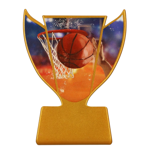 Metalowa statuetka koszykarska z grafiką przedstawiającą piłkę wpadającą do kosza. Motyw ten jednoznacznie nawiązuje do akcji rzutowej w koszykówce i dobrze pasuje do nagród przyznawanych podczas turniejów, zawodów szkolnych oraz rozgrywek klubowych. Przednia część statuetki zawiera kolorową grafikę kosza i piłki na tle hali sportowej, osadzoną w złotej metalowej ramie. Całość wykonana jest z metalu i utrzymana w złotym kolorze, dzięki czemu nagroda dobrze prezentuje się na podium, stole sędziowskim lub w gablocie klubowej.