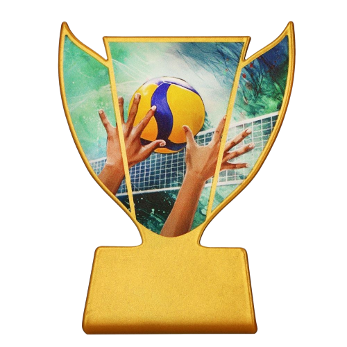 Statuetka metalowa Slim Line SL-VOL to niewielka nagroda sportowa przygotowana na turnieje i wydarzenia związane z siatkówką. Front statuetki zdobi grafika piłki siatkowej nad siatką i dłoni zawodników przy akcji pod siatką, dzięki czemu motyw dyscypliny jest od razu czytelny. Złota podstawa i obramowanie porządkują całość i dobrze pasują do charakteru nagrody wręczanej podczas rozgrywek siatkarskich. To model, który sprawdzi się tam, gdzie potrzebna jest mała statuetka z miejscem na personalizację.
