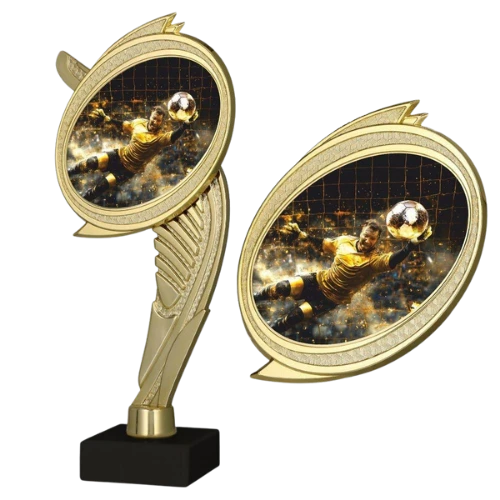 Statuetka z plastiku na marmurowej podstawie z motywem piłki nożnej. Górna część ma formę „skrzydła”, a z przodu znajduje się okrągły medalion z grafiką przedstawiającą bramkarza w paradzie (interwencja przy piłce) na ciemnym tle. Na podstawie można zamocować tabliczkę z nadrukiem.