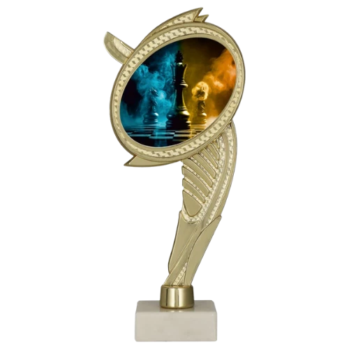 Trofeum plastikowe na marmurowej podstawie WING-WM/CHE to nagroda przygotowana z myślą o wydarzeniach związanych z szachami. Górną część trofeum uzupełnia owalna wkładka z grafiką figur szachowych ustawionych na szachownicy, dzięki czemu charakter wyróżnienia jest od razu czytelny i dobrze pasuje do turniejów, rozgrywek szkolnych oraz wydarzeń organizowanych przez kluby i stowarzyszenia szachowe. Złota forma w połączeniu z jasną marmurową podstawą porządkuje całość i nadaje modelowi klasyczny wygląd. To propozycja odpowiednia tam, gdzie potrzebne jest nieduże trofeum szachowe z wyraźnym motywem dyscypliny.