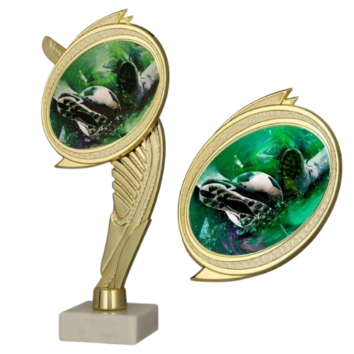 Trofeum z plastiku na marmurowej podstawie z motywem piłki nożnej. Część ozdobna ma formę „skrzydła”, a z przodu znajduje się okrągły medalion z grafiką piłkarską w zielonej kolorystyce. Podstawa jest z marmuru, na niej można zamocować tabliczkę z nadrukiem.