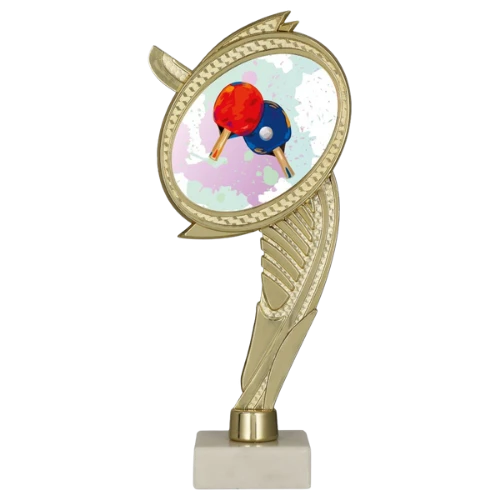 Trofeum plastikowe na marmurowej podstawie WING-WM/TAB to nagroda przygotowana z myślą o wydarzeniach związanych z tenisem stołowym. Górną część trofeum uzupełnia okrągła wkładka z grafiką rakietek i piłeczki, dzięki czemu motyw dyscypliny jest od razu czytelny i dobrze pasuje do turniejów, zawodów szkolnych oraz rozgrywek klubowych. Złota forma w połączeniu z jasną marmurową podstawą porządkuje całość i tworzy klasyczną oprawę dla nagrody sportowej. To model odpowiedni tam, gdzie potrzebne jest nieduże trofeum tenis stołowy z miejscem na personalizację.