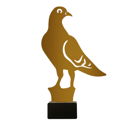 - metalowe trofeum z motywem gołębia (czytelna sylwetka ptaka)