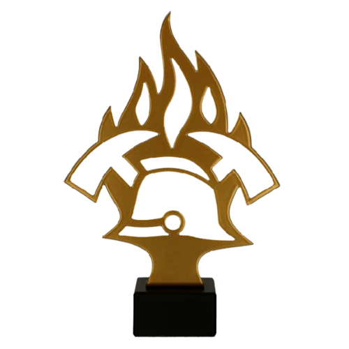 Statuetka metalowa Atrybuty Strażaka ML-FIR1 to nagroda przygotowana z myślą o wydarzeniach związanych ze strażactwem. Forma przedstawia strażacki hełm, skrzyżowane topory oraz motyw płomieni, dzięki czemu tematyka wyróżnienia jest od razu czytelna i dobrze pasuje do uroczystości, zawodów oraz wydarzeń organizowanych przez jednostki strażackie. Złote wykończenie w połączeniu z ciemną marmurową podstawą porządkuje całość i nadaje modelowi reprezentacyjny charakter. To propozycja odpowiednia tam, gdzie potrzebna jest nieduża statuetka strażacka z wyraźnym motywem dyscypliny.