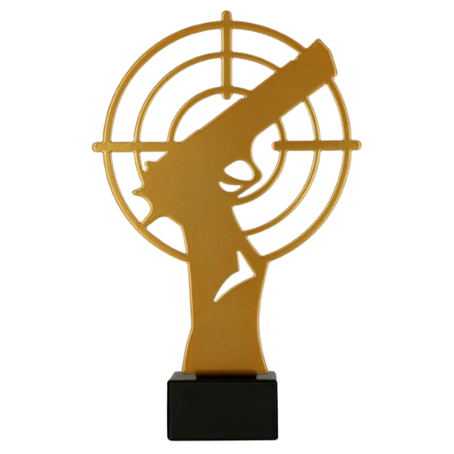 Statuetka metalowa Złoty Pistolet ML-SHO3 to nagroda przygotowana z myślą o wydarzeniach związanych ze strzelectwem. Forma przedstawia tarczę strzelecką z motywem pistoletu, dzięki czemu charakter wyróżnienia jest od razu czytelny i dobrze pasuje do zawodów, turniejów oraz wydarzeń organizowanych przez kluby i stowarzyszenia strzeleckie. Złote wykończenie w połączeniu z ciemną marmurową podstawą porządkuje całość i nadaje modelowi reprezentacyjny charakter. To propozycja odpowiednia tam, gdzie potrzebna jest nieduża statuetka strzelecka z wyraźnym motywem dyscypliny.