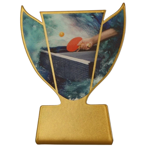 - statuetka sportowa z grafiką rakietki, piłeczki oraz stołu do tenisa stołowego