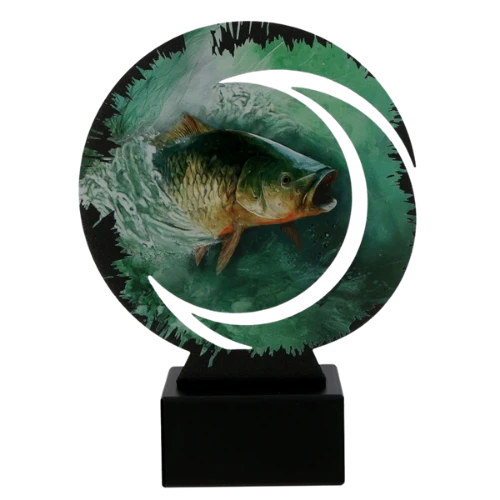 Na marmurowej podstawie pucharu można umieścić tabliczkę z nadrukiem. To miejsce na nazwę zawodów, kategorię nagrody, datę wydarzenia, nazwę koła wędkarskiego albo imię i nazwisko uczestnika.