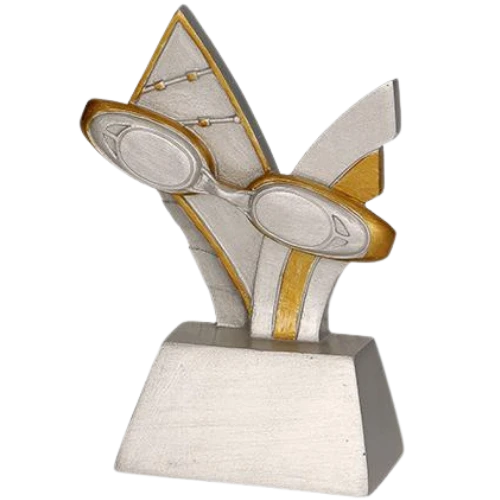 Figurka odlewana RE026 to sportowa nagroda przygotowana z myślą o zawodach i wydarzeniach związanych z pływaniem. Model przedstawia okularki pływackie oraz stylizowane linie nawiązujące do ruchu i dynamiki w wodzie, dzięki czemu jednoznacznie odnosi się do tej dyscypliny. Połączenie srebrnej kolorystyki ze złotymi akcentami nadaje całości estetyczny, sportowy charakter. Figurka została osadzona na solidnej podstawie, co sprawia, że dobrze prezentuje się jako wyróżnienie wręczane podczas zawodów pływackich i eventów sportowych.