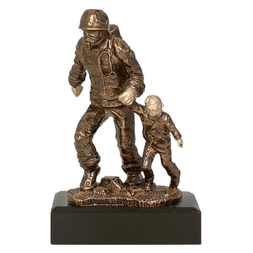 Statuetka odlewana Strażak bohater RFST2020/BR to nagroda okolicznościowa przygotowana z myślą o wydarzeniach związanych ze strażactwem. Forma przedstawia strażaka prowadzącego i osłaniającego dziecko, dzięki czemu przekaz statuetki od razu kojarzy się z pomocą, odpowiedzialnością i ochroną życia. Brązowe wykończenie dobrze pasuje do charakteru wyróżnień wręczanych podczas uroczystości strażackich, a ciemna podstawa porządkuje całość i tworzy miejsce na personalizację. To model odpowiedni na jubileusze, podziękowania, wydarzenia jednostek OSP i PSP oraz uroczystości, podczas których nagradzane są postawy związane ze służbą, odwagą i zaangażowaniem.