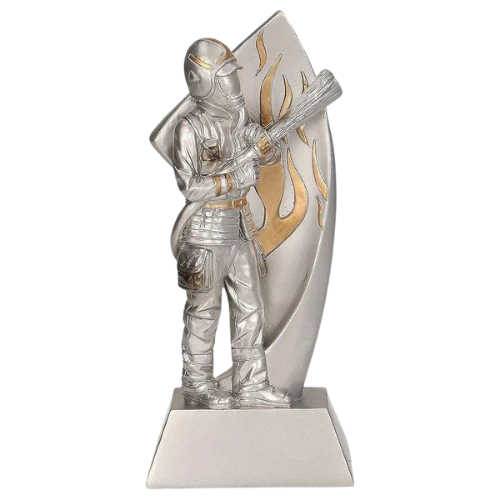 Statuetka odlewana Pogromca Płomieni RP2010 to nagroda okolicznościowa przygotowana z myślą o wydarzeniach związanych ze strażactwem. Forma przedstawia strażaka trzymającego prądownicę na tle stylizowanego motywu płomieni, dzięki czemu tematyka wyróżnienia jest od razu czytelna i dobrze wpisuje się w charakter uroczystości strażackich. Srebrno-złota kolorystyka odróżnia ten model od klasycznych statuetek brązowych, a całość zachowuje spójny, reprezentacyjny wygląd. To model odpowiedni na jubileusze, zawody pożarnicze, wydarzenia jednostek OSP i PSP oraz uroczystości, podczas których wręczane są podziękowania i wyróżnienia związane ze służbą strażacką.
