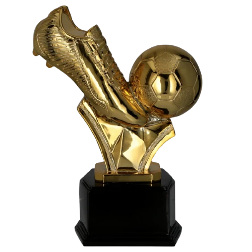 Reprezentacyjna figurka piłkarska w formie złotego buta i piłki nożnej, przygotowana specjalnie do wyróżnień za zdobyte bramki. Błyszczące wykończenie przyciąga uwagę podczas dekoracji, a dopracowane detale – sznurowanie, faktura cholewki oraz kształt korka – podkreślają sportowy charakter nagrody. Obok buta znajduje się piłka z wyraźną strukturą paneli, dzięki czemu motyw jest czytelny i idealnie kojarzy się z rolą napastnika oraz skutecznością pod bramką. Całość osadzona jest na stabilnej, czarnej podstawie, która nadaje całości elegancki wygląd i dobrze prezentuje się w gablocie klubowej.