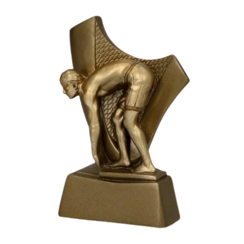 Figurka odlewana RP4018 to nagroda sportowa przygotowana z myślą o zawodach i wydarzeniach związanych z pływaniem. Model przedstawia sylwetkę zawodniczki w pozycji startowej na tle stylizowanego motywu nawiązującego do sportów wodnych, dzięki czemu jednoznacznie odnosi się do tej dyscypliny. Złota kolorystyka nadaje całości klasyczny, sportowy charakter, a zwarta forma sprawia, że figurka dobrze prezentuje się jako wyróżnienie wręczane podczas zawodów pływackich. To odpowiedni wybór dla organizatorów, którzy szukają niewielkiej nagrody z czytelnym motywem pływania i miejscem na personalizację.