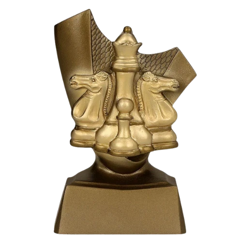 Statuetka odlewana złota RP4026 to niewielka nagroda przygotowana z myślą o wydarzeniach związanych z szachami. Front statuetki tworzy kompozycja figur szachowych, w której centralne miejsce zajmuje król, a całość uzupełniają konie i motyw szachownicy w tle. Dzięki temu charakter wyróżnienia jest od razu czytelny i dobrze pasuje do turniejów, rozgrywek szkolnych oraz wydarzeń organizowanych przez kluby i stowarzyszenia szachowe. Złota kolorystyka nadaje modelowi klasyczny wygląd, a odlewana podstawa porządkuje całość i tworzy miejsce na personalizację.