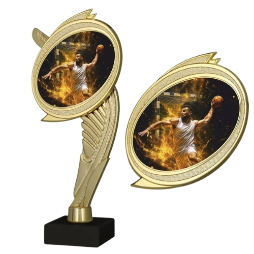 Puchar plastikowy złoty 7249/HAN to seria trofeów przygotowanych z myślą o wydarzeniach związanych z piłką ręczną. Model wyróżnia się smukłą, dekoracyjną formą w złotym kolorze oraz owalnym frontem z grafiką zawodnika wykonującego rzut, co wyraźnie podkreśla charakter dyscypliny. Całość została osadzona na marmurowej podstawie, która nadaje nagrodzie stabilność i pozwala na zamocowanie tabliczki z nadrukiem. Seria dobrze sprawdzi się na turniejach, zawodach szkolnych, rozgrywkach klubowych i innych wydarzeniach sportowych, gdzie potrzebne są puchary w kilku wysokościach.