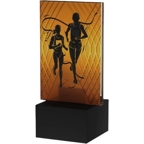 Szklana statuetka sportowa z motywem biegania przedstawia dwóch zawodników rywalizujących na trasie biegu. Na powierzchni szklanej płyty znajduje się grafika biegaczy w trakcie wyścigu, z wyraźnie zaznaczoną linią mety i rozwijającą się wstęgą. Sylwetki sportowców ukazane są w dynamicznym ruchu, co dobrze oddaje moment finiszu zawodów biegowych. Tło statuetki utrzymane jest w złoto-pomarańczowej kolorystyce, z dekoracyjnym wzorem przypominającym linie bieżni. Całość zamocowana jest na czarnej podstawie, na której można umieścić tabliczkę z grawerem.