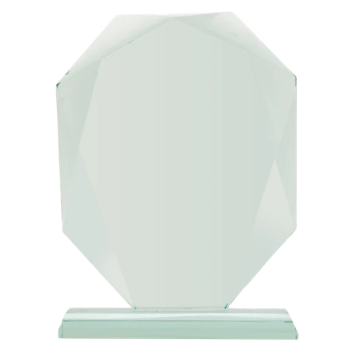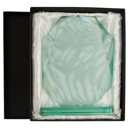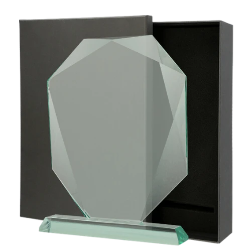 Statuetka szklana G042 to trofeum szklane w kształcie ośmiokątnej tarczy z efektownie fazowanymi krawędziami. Masywna bryła ze szkła o grubości 1,9 cm i charakterystyczne cięcia pod kątem tworzą grę świateł – nagroda wygląda wyjątkowo zarówno na biurku, jak i na półce z trofeami. Czarne etui w komplecie nadaje całości ekskluzywny, prestiżowy charakter.