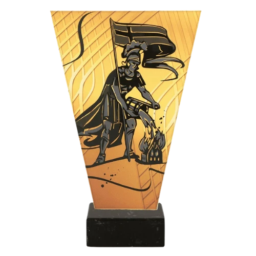 Trofeum szklane V-Line VL1-FIR/BK to nagroda przygotowana z myślą o wydarzeniach związanych ze strażactwem. Front trofeum zdobi grafika św. Floriana na tle złoto-czarnej kompozycji, dzięki czemu tematyka wyróżnienia jest od razu czytelna i dobrze pasuje do uroczystości, jubileuszy oraz wydarzeń organizowanych przez jednostki strażackie. Złota kolorystyka dobrze współgra z okolicznościowym charakterem nagrody, a ciemna marmurowa podstawa porządkuje całość i tworzy miejsce na personalizację. To model odpowiedni tam, gdzie potrzebne jest wyraziste trofeum strażackie dostępne w kilku wysokościach.