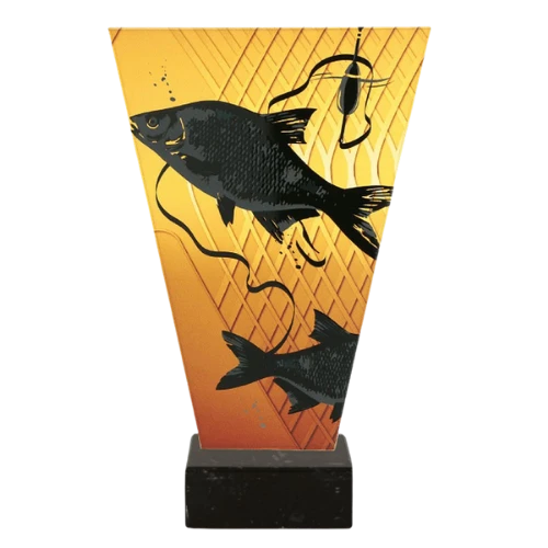 Trofeum V-Line VL1/FIS1/BK to nagroda przygotowana na zawody i wydarzenia związane z wędkarstwem. Na szklanym froncie umieszczono grafikę leszcza, dzięki czemu motyw dyscypliny jest od razu czytelny i dobrze pasuje do konkursów wędkarskich, spotkań kół oraz imprez organizowanych nad wodą. Złoto-czarna stylistyka w połączeniu z marmurową podstawą tworzy spójną formę nagrody, która dobrze prezentuje się podczas wręczenia. To model odpowiedni dla organizatorów, którzy szukają trofeum wędkarskiego dostępnego w kilku wysokościach i z miejscem na personalizację.