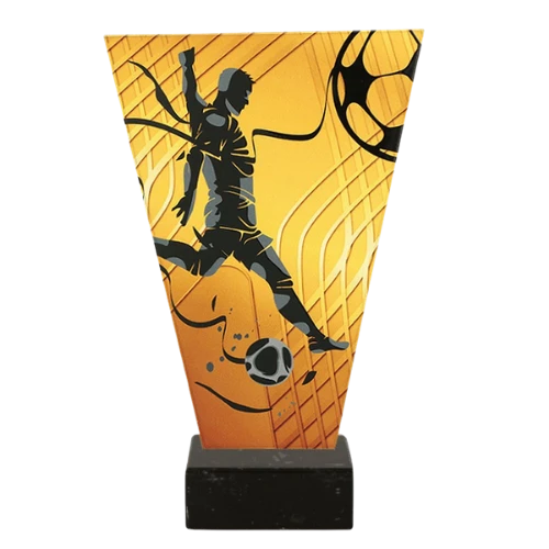 Trofeum szklane V-Line VL1-A/SOC1/BK to piłkarska nagroda z nadrukowaną grafiką zawodnika i piłki na tle bramki. Smukła forma oraz złoto-czarna kolorystyka sprawiają, że model dobrze prezentuje się podczas turniejów, rozgrywek i wydarzeń sportowych związanych z piłką nożną. Szklana część ozdobna została osadzona na ciemnej marmurowej podstawie, co podkreśla estetyczny charakter trofeum i daje miejsce na personalizację. To odpowiedni wybór dla organizatorów, którzy szukają efektownego trofeum piłkarskiego z czytelnym motywem dyscypliny.