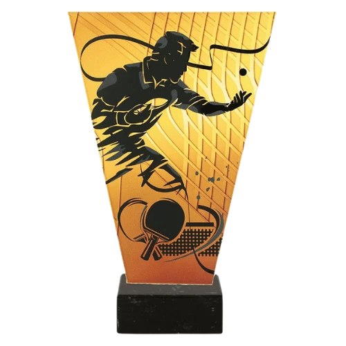 Trofeum szklane V-Line to nagroda sportowa przygotowana na turnieje i wydarzenia związane z tenisem stołowym. Front trofeum zdobi grafika zawodnika w trakcie gry, rakietki oraz piłeczki, dzięki czemu motyw dyscypliny jest od razu czytelny i dobrze pasuje do rozgrywek szkolnych, klubowych oraz amatorskich. Złoto-czarna kolorystyka porządkuje całość, a marmurowa podstawa tworzy miejsce na personalizację. To model odpowiedni tam, gdzie potrzebne jest trofeum tenis stołowy dostępne w kilku wysokościach.