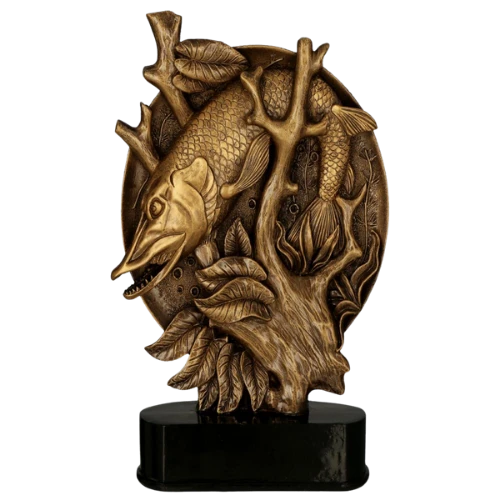 Statuetka odlewana Szczupak Pod Wodą RFST3049/BR to nagroda przygotowana z myślą o wydarzeniach związanych z wędkarstwem. Front statuetki przedstawia szczupaka w podwodnym otoczeniu, pomiędzy gałęziami i roślinnością, dzięki czemu motyw dyscypliny jest od razu czytelny i dobrze pasuje do zawodów oraz konkursów wędkarskich. Brązowa kolorystyka porządkuje całość i dobrze współgra z charakterem nagrody wręczanej podczas wydarzeń związanych z połowem ryb. To model odpowiedni tam, gdzie potrzebna jest statuetka z wyraźnym motywem szczupaka i miejscem na personalizację.
