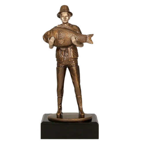 Statuetka odlewana Wędkarz to nagroda przygotowana na zawody i wydarzenia związane z wędkarstwem. Model przedstawia postać wędkarza trzymającego okazałą rybę, dzięki czemu charakter wyróżnienia jest od razu czytelny i dobrze dopasowany do konkursów, spotkań kół wędkarskich oraz imprez plenerowych. Brązowe wykończenie podkreśla klasyczny wygląd statuetki, a ciemna podstawa porządkuje całość i tworzy miejsce na personalizację. To propozycja dla organizatorów, którzy szukają nagrody z wyraźnym motywem wędkarskim, dostępnej w kilku wysokościach.